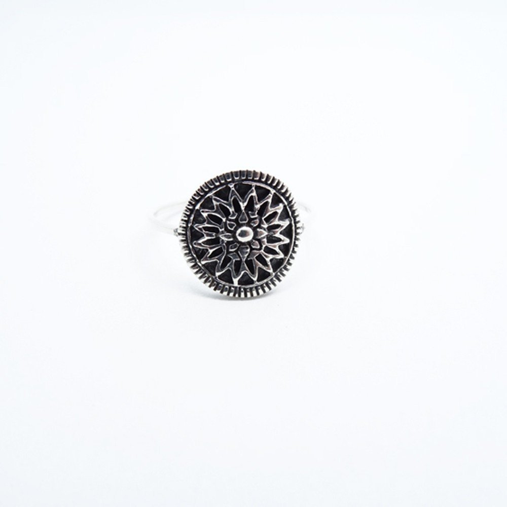 Bonito anillo en forma redonda con un grabado de una flor.
