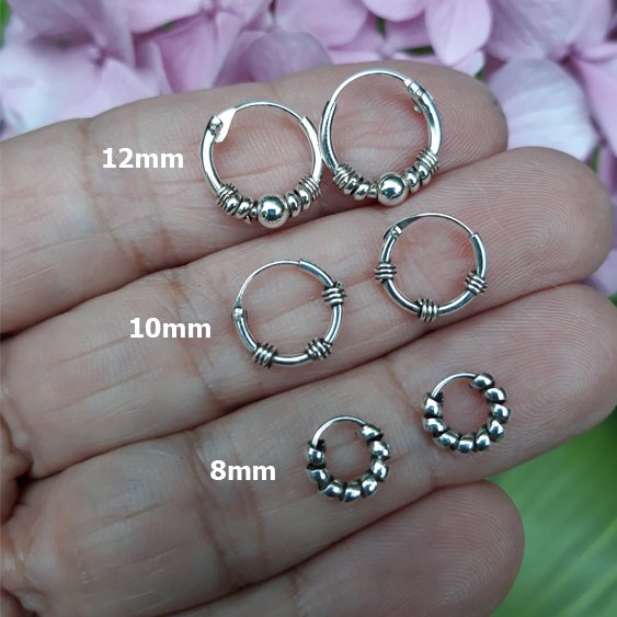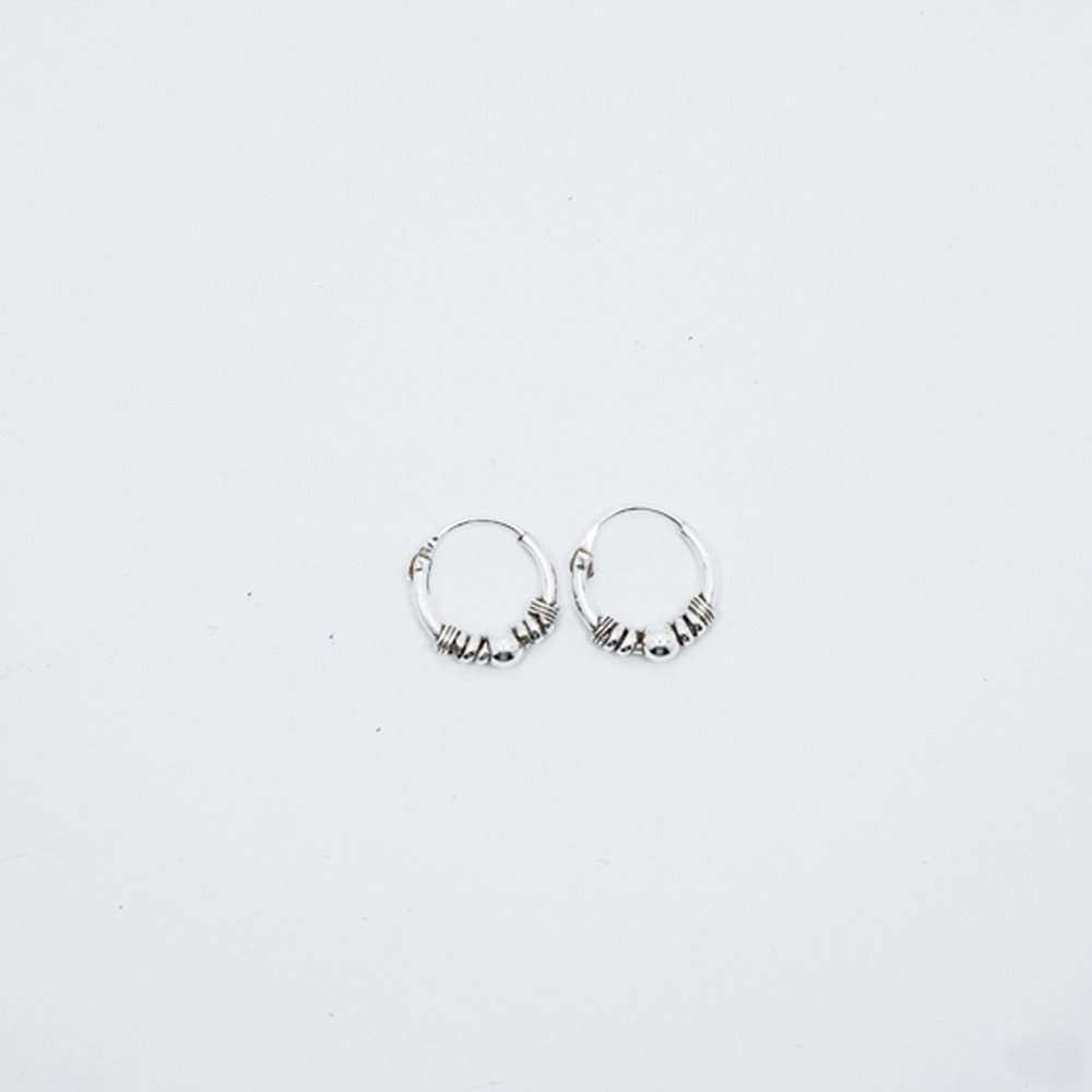 Este arito lleva una bolita en el centro y un hilo de plata enrollado a ambos lados.