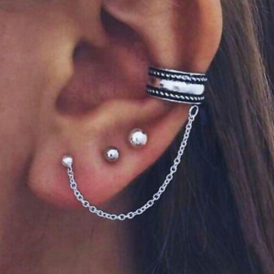 Tiene una cadenita con un pendiente de bola para el agujero del lóbulo.