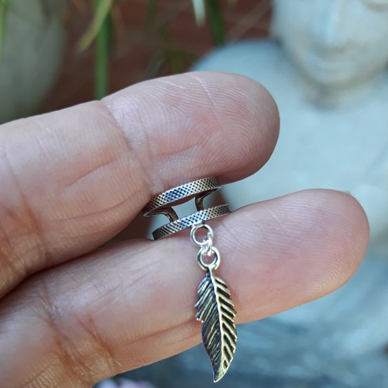 Cartílago de doble aro labrado con pluma colgando.