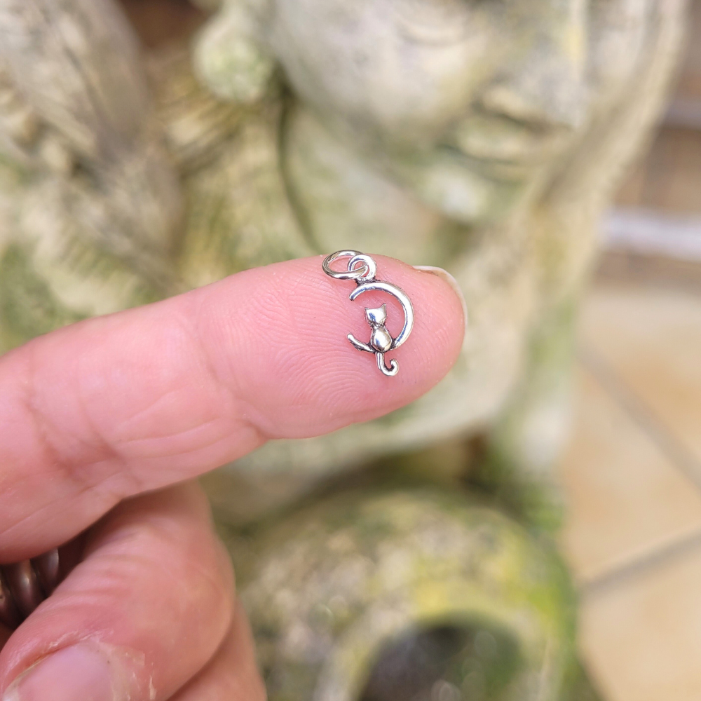 Colgante de plata en forma de media luna con un gato sentada en ella.
