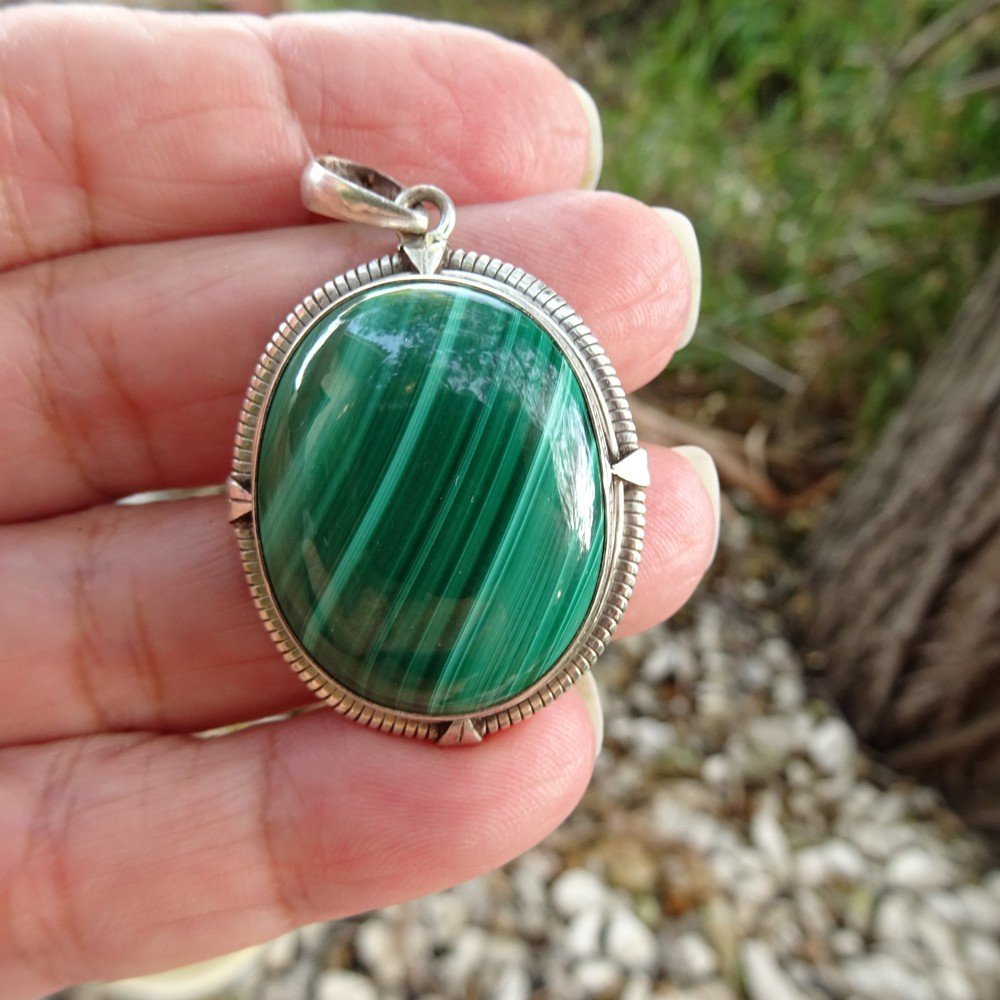Colgante malaquita ovalada engarzada en plata labrada