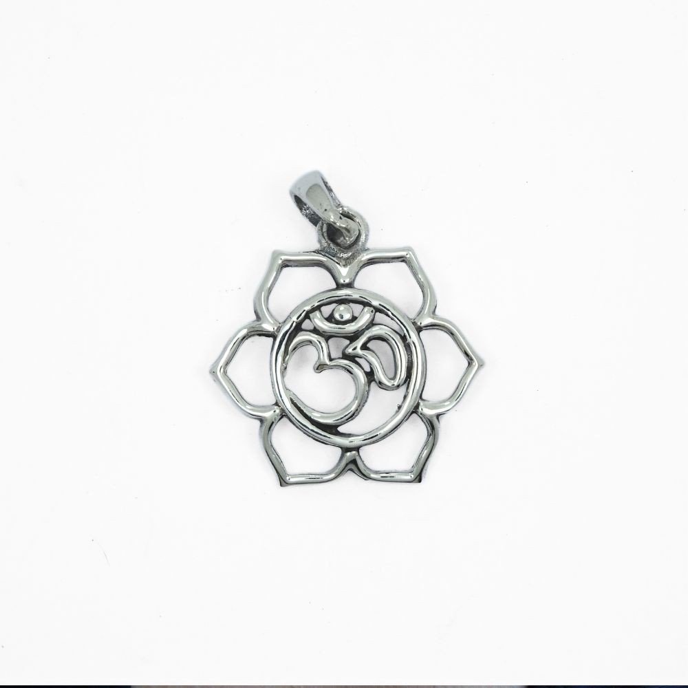 Colgante de plata en forma de ohm enmarcado en una flor.