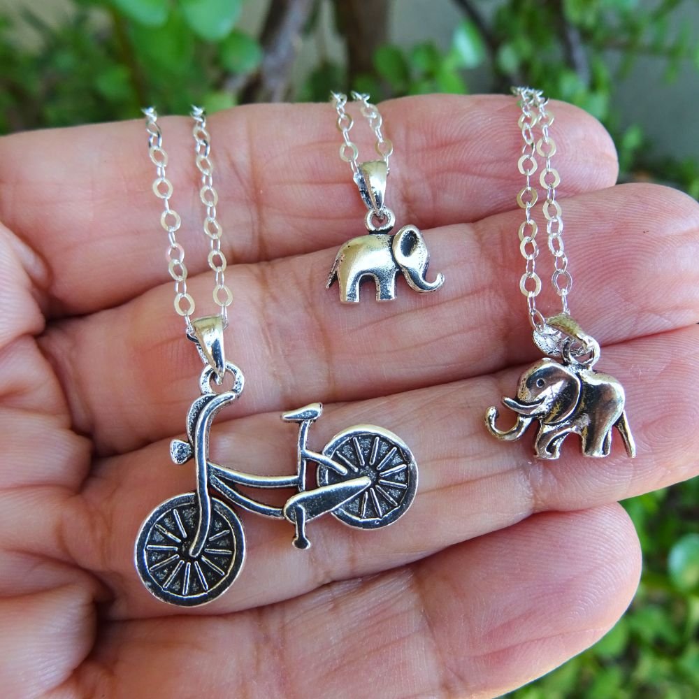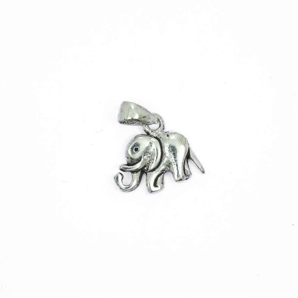 Colgante de plata en forma de elefante con la trompa hacia arriba.