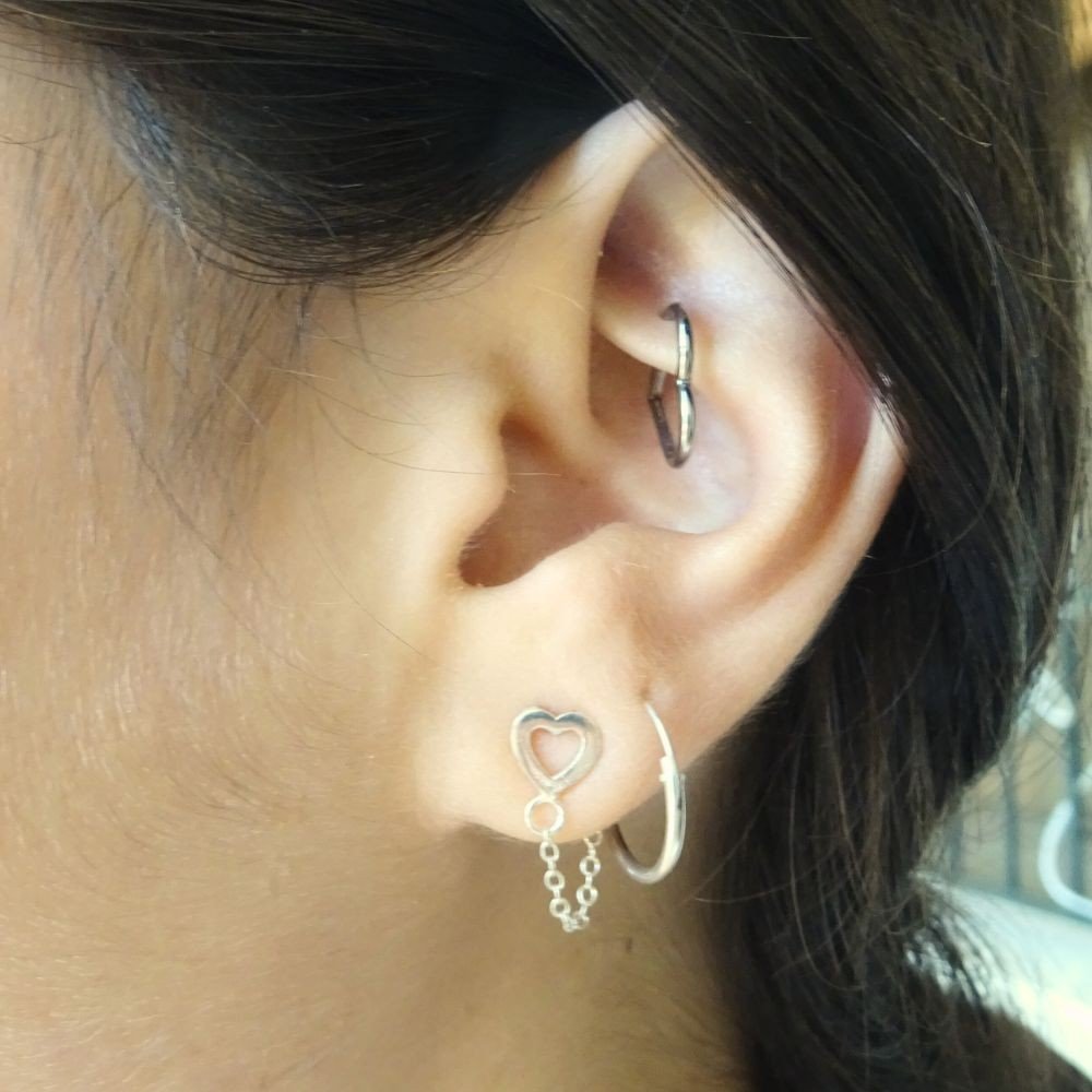 Colgante de plata en forma de corazón hueco con una cadenita colgando.
