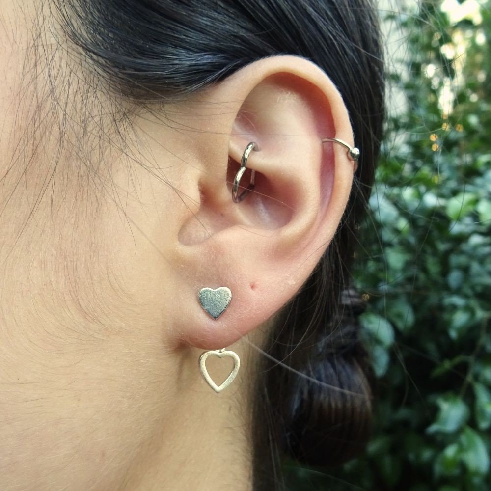 Pendiente formado por dos corazones de plata unidos por una cadenita.